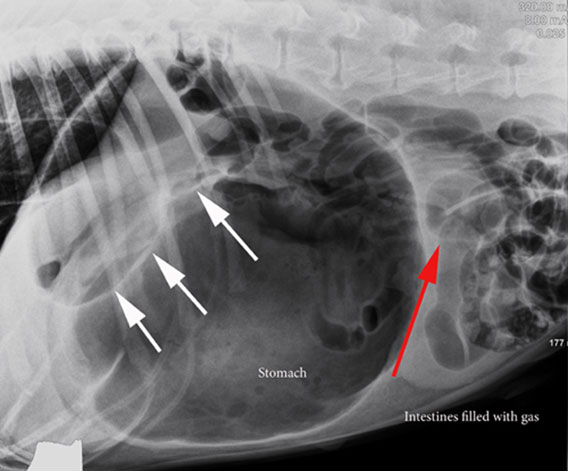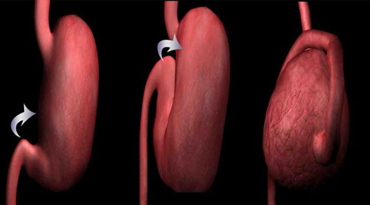 2. tano il sangue al cuore. Questo ostacola la normale circolazione sanguigna e causa uno stato di shock. A complicare il quadro si aggiunge la necrosi gastrica in quanto la parete dello stomaco é talmente distesa da non permettere l’apporto ematico all’organo stesso. Non c’é possibilità di guarigione se lo stomaco non viene detorto e il gas viene eliminato. Di solito viene effettuata una lavanda gastrica con un tubo ma a volte é necessaria la chirurgia per completare la decompressione dello stomaco.